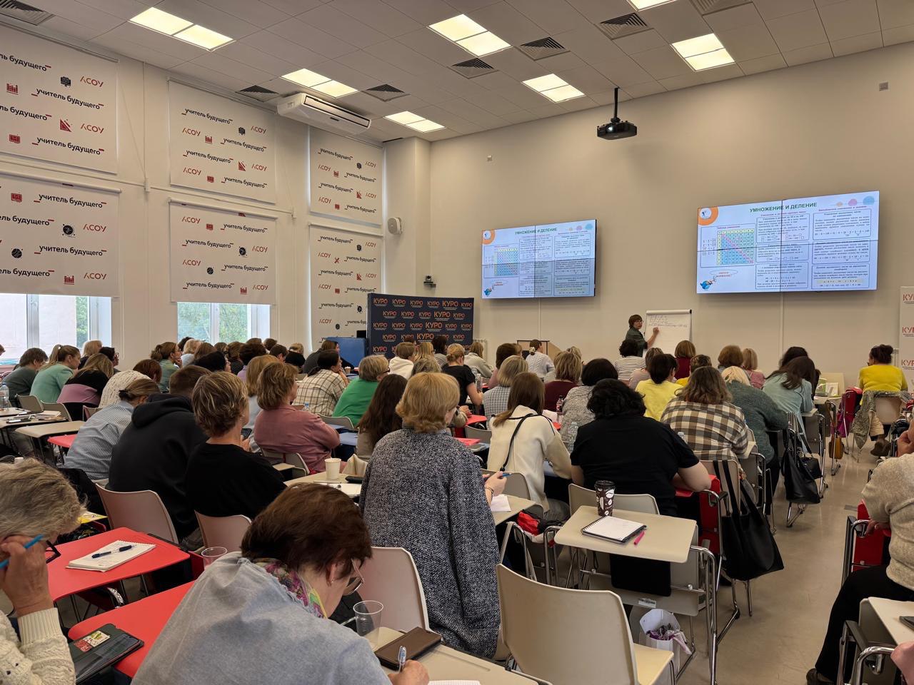 С 06 по 10 октября 2025 года в каникулярный период в КУРО по адресу г. Москва, Староватутинский проезд, д. 8 была проведена очная дополнительная профессиональная программа (повышение квалификации) «Углубленное изучение учебного предмета «Математика» в начальной школе на основе программы Л.Г. Петерсон» в объеме 36 часов. Цель реализации программы: совершенствование профессиональных компетенций учителей начальных классов в части освоения содержания и методики преподавания учебного предмета «Математика» на углубленном уровне по программе Л.Г. Петерсон. Занятия проходили ежедневно с 10.00 до 16.00. Преподавала курс Зобнина Марина Александровна, методист НОУ "Институт системно-деятельностной педагогики". В обучении приняли участие 75 педагогов начального общего образования общеобразовательных организаций Московской области. После окончания обучения 70 педагогов успешно прошли итоговую аттестацию. По просьбам слушателей с 17 ноября по 21 ноября 2025 года в каникурярный период будет реализован второй поток обучения по данной программе.